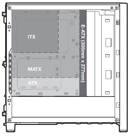 Корпус представляет собой решение башенного типа с вертикально размещаемой платой формата ATX (и менее габаритной) и горизонтальным расположением блока питания снизу. Также заявлена поддержка укороченных плат E-ATX длиной до 277 мм.