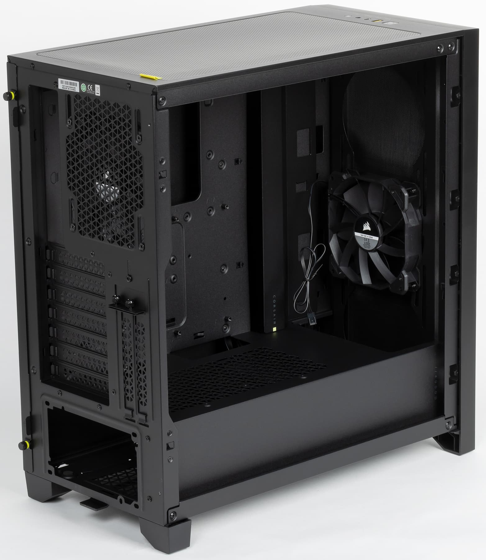 В корпусе предустановлены два вентилятора Corsair AirGuide типоразмера 120 мм со скоростью вращения около 1150 об/мин: один спереди и один сзади.