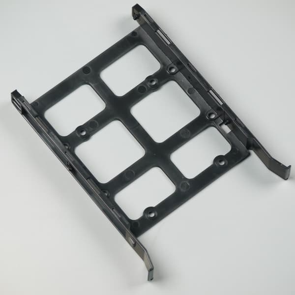Полноразмерные жесткие диски устанавливаются в предназначенную для них двухместную корзину через пластиковые рамки. Диск крепится к ним с помощью четырех пластиковых штырей. Дополнительно полноразмерный диск можно зафиксировать винтами со стороны дна.