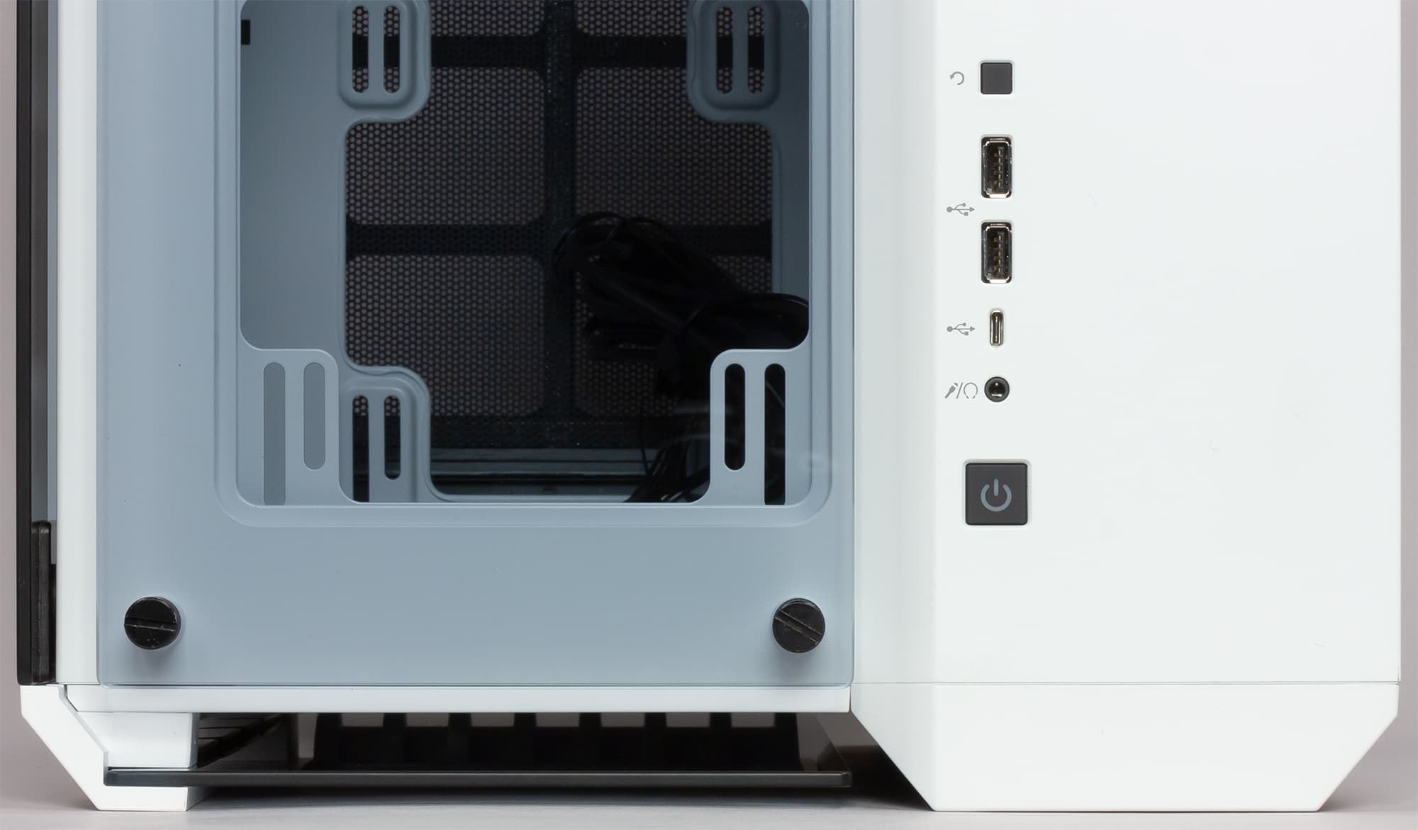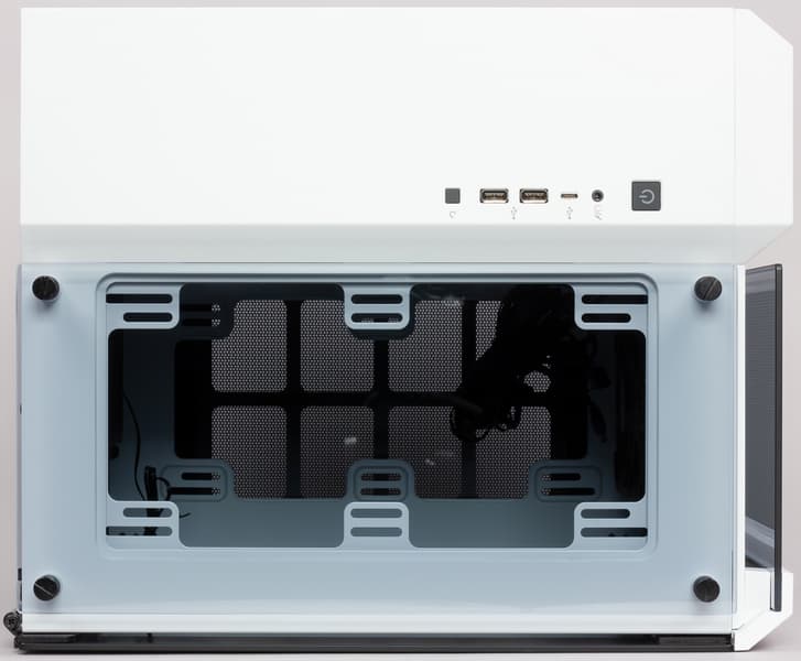 Органы управления и внешние разъемы размещены одним рядом в правой части верхней панели. Набор не слишком богатый: кроме кнопок, есть два порта USB 3.1 Type-A и один Type-C, аудиоразъем единый для наушников и микрофона. Кнопка Power имеет встроенную подсветку белого цвета, индикатора дисковой активности нет.