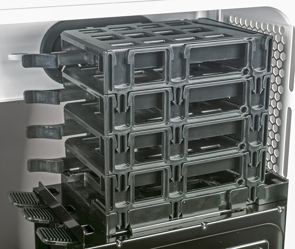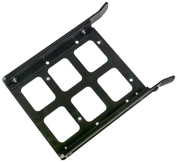 Накопители в трехместную корзину вставляются с помощью пластиковых салазок, в которых 3,5-дюймовые модели крепятся боковыми штифтами, причем имеются и резиновые амортизирующие прокладки, а 2,5-дюймовые — винтами снизу, амортизатором для них будет сам пластик салазок.