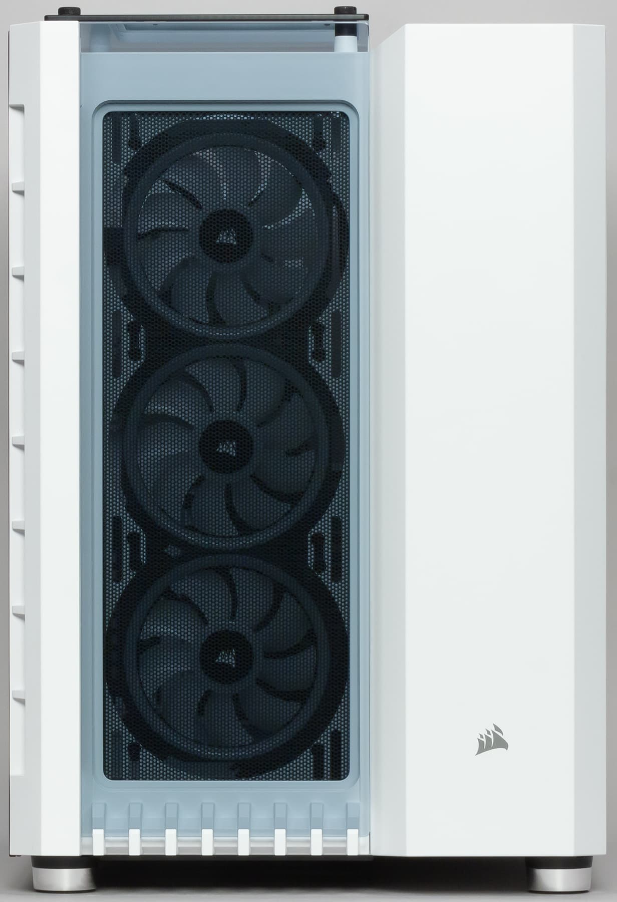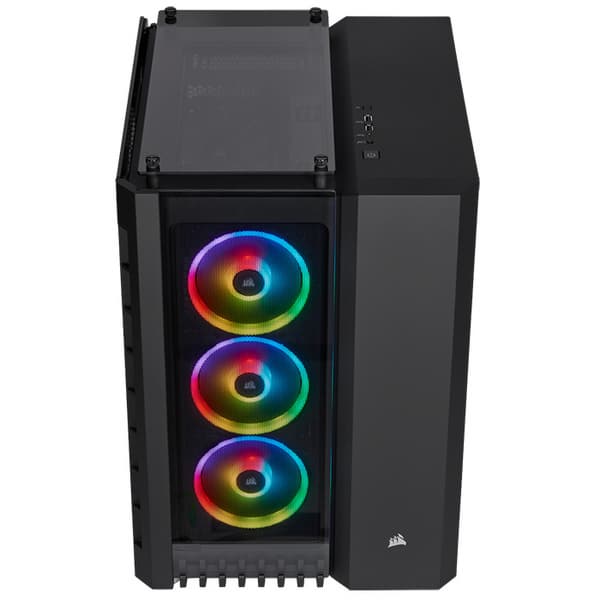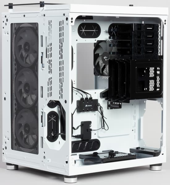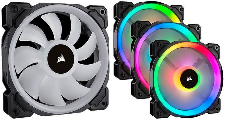 В штатное оснащение корпуса входят три 120-миллиметровых вентилятора Corsair LL120, оснащенных 16 независимыми RGB-светодиодами на двух отдельных световых контурах, что обеспечивает яркую подсветку с визуальными эффектами.