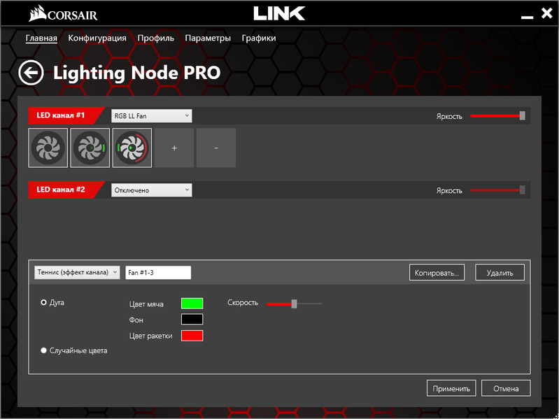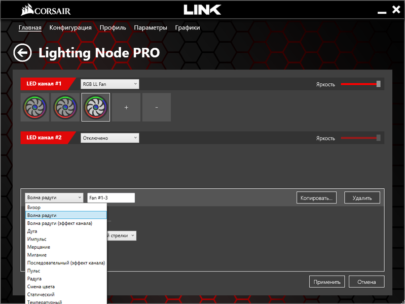 Оценить выбранный эффект до нажатия «Применить» можно по анимированным изображениям вентиляторов в верхнем поле. Выбирая в этом поле тот или иной вентилятор, можно задать разные эффекты для каждого. А если нажимать там же кнопку «−», то из системы подсветки будет исключен один из вентиляторов — сначала верхний, потом средний, потом нижний (конечно, порядок зависит от номеров разъемов концентратора, сейчас речь о подключениях по умолчанию).