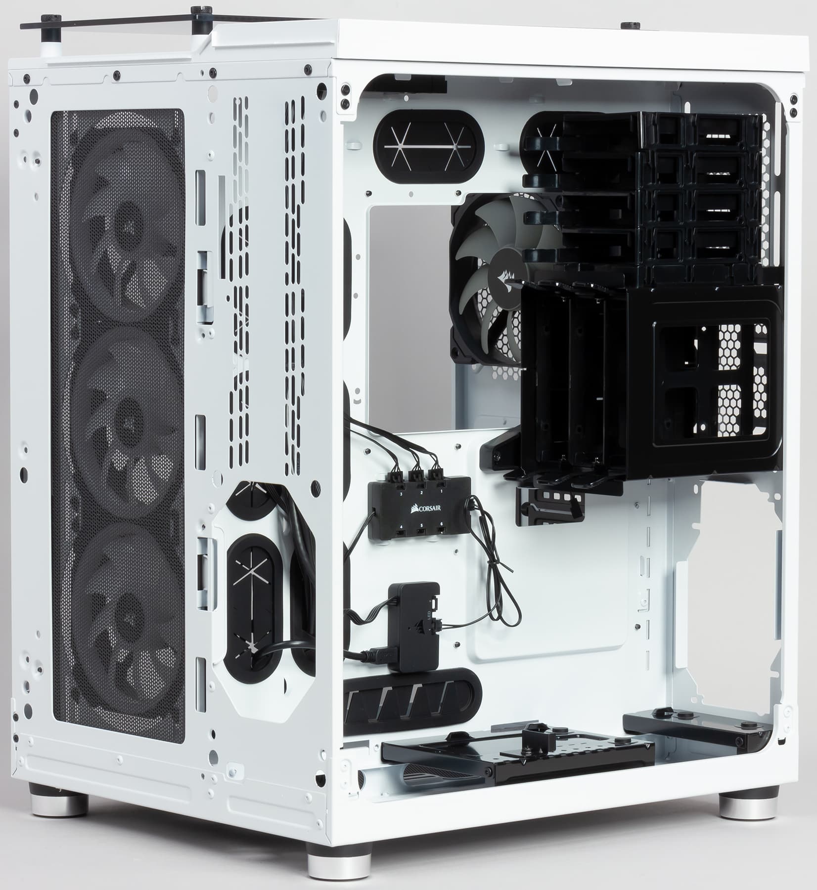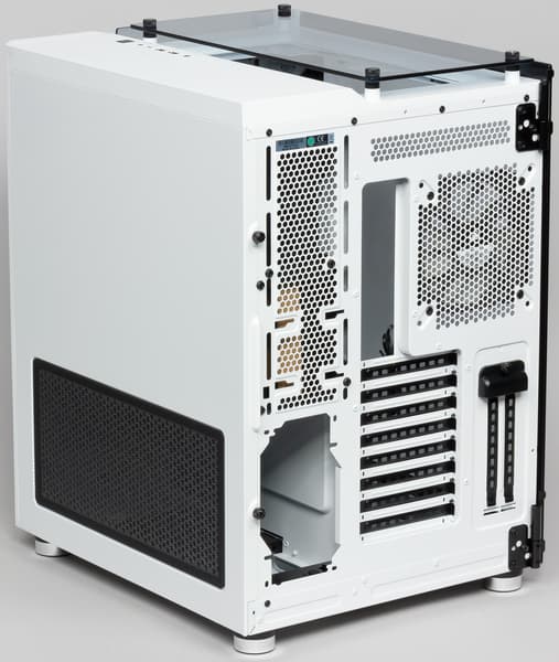 Форм-фактор нового корпуса заявлен как ATX. По высоте он немного больше и потому ближе к miditower, чем предшественник Air 540, но тоже с почти удвоенной шириной. Внутренний объем разделен на два отсека: в левом (он побольше) размещается системная плата, платы расширения, включая видеокарты, и элементы системы охлаждения. Соответственно все это будет просматриваться через стеклянную левую стенку.
