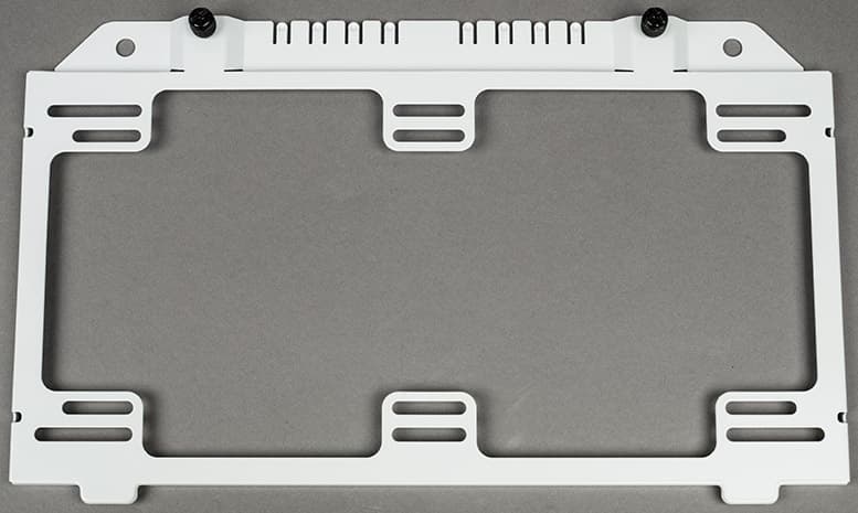 Стойки для платы формата ATX уже установлены, а если планируется использовать плату другого размера, то часть из них придется переставить. Отверстие для портов ввода-вывода на задней панели заглушки не имеет, две вертикальных и восемь горизонтальных прорезей для плат расширения закрыты многоразовыми заглушками. Крепление плат расширения — винтами с накатной головкой, для располагаемых горизонтально доступ к винтам изнутри, для вертикальных снаружи (их крепежная планка прикрыта пластиковой крышечкой с одним винтом).
