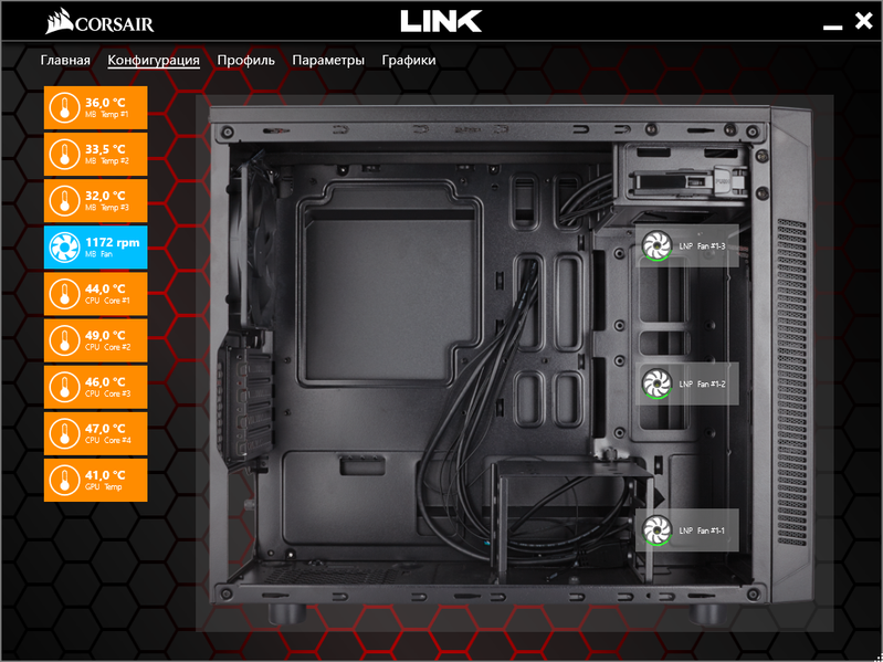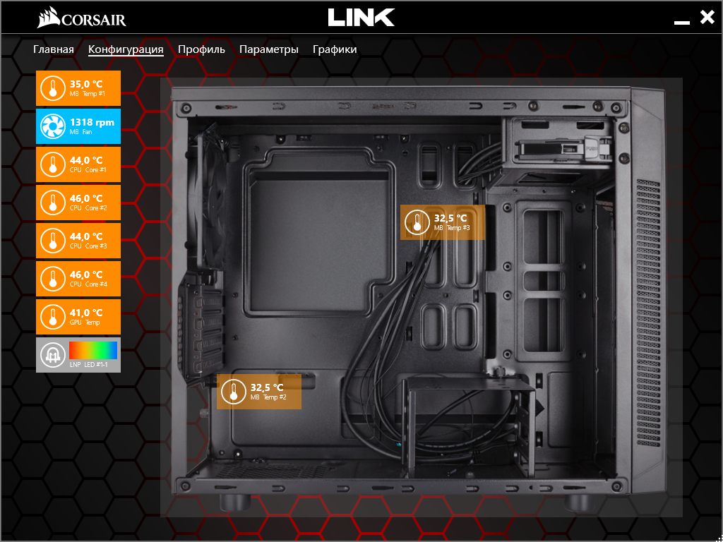 Помимо управления подсветкой, Corsair Link осуществляет и мониторинг компонентов компьютера — системной платы, процессора, видеокарты, памяти. Отображаются текущие значения температур, некоторых напряжений, частоты вращения вентиляторов и т. п., для некоторых величин можно отслеживать изменения в виде графиков.