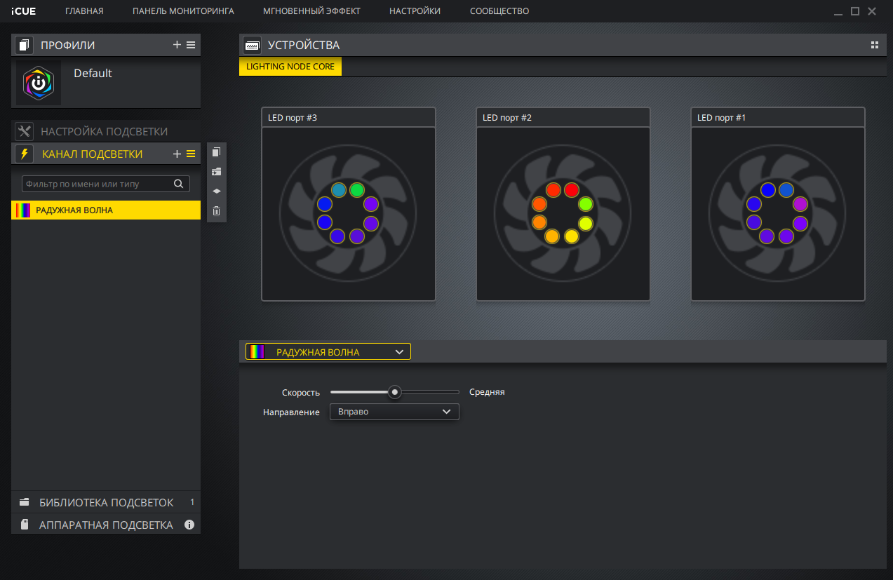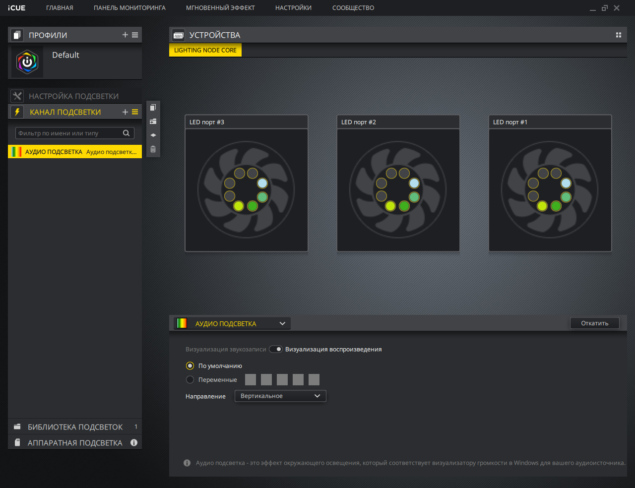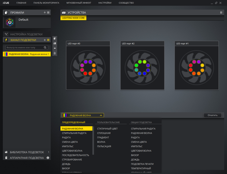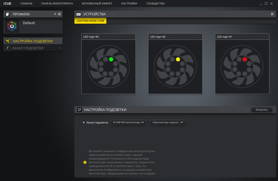 Канал управления подсветкой тут всего один, в отличие от Corsair Carbide Series SPEC-Omega RGB, у которого используется более функциональный контроллер, имеющий два канала управления подсветкой. Скоростью вращения вентиляторов контроллер не управляет, он «занимается» исключительно подсветкой. В качестве источника света применены вентиляторы типоразмера 120 мм Corsair SP120 RGB Pro с индивидуальной адресацией светодиодов, все три вентилятора установлены по умолчанию спереди. Для управления подсветкой корпуса необходимо самостоятельно скачать ПО iCue с официального сайта Corsair и установить его. После запуска нужно произвести первоначальную настройку.