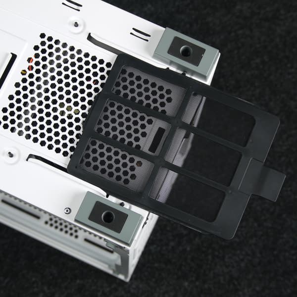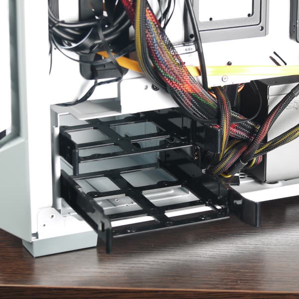 Полноразмерные жесткие диски устанавливаются в предназначенную для них двухместную корзину через пластиковые рамки. Диск крепится к ним с помощью четырех пластиковых штырей. Дополнительно полноразмерный диск можно зафиксировать винтами со стороны дна.