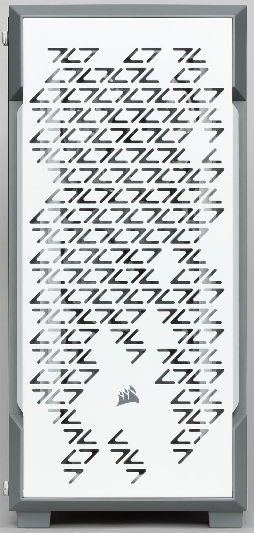 Corsair iCue 220T RGB Airflow Tempered Glass Mid-Tower Smart Case — это новая бюджетная модель с оформлением передней панели в виде решетки, которую формируют множество разнонаправленных V-образных элементов. Дизайн получился неплохой и довольно свежий.