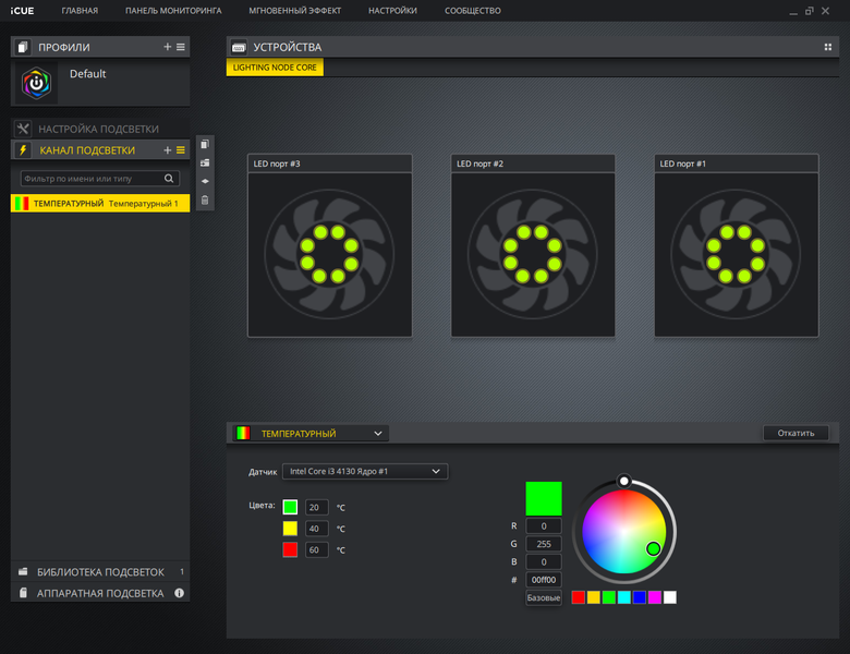Мы обнаружили интересный режим: индикация температуры компонентов ПК путем изменения цвета подсветки. Функция работает вполне исправно.