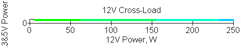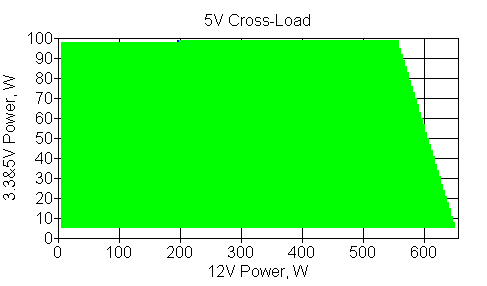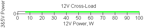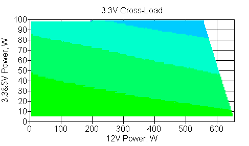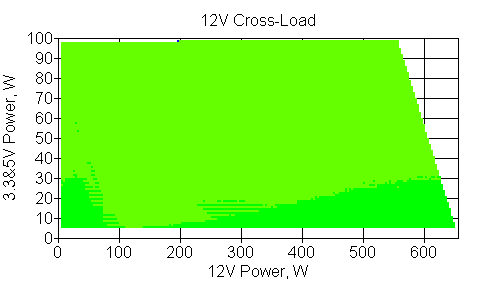 Следующим этапом инструментального тестирования является построение кросснагрузочной характеристики (КНХ) и представление ее на четвертьплоскости, ограниченной максимальной мощностью по шине 3,3&5 В с одной стороны (по оси ординат) и максимальной мощностью по шине 12 В с другой (по оси абсцисс). В каждой точке измеренное значение напряжения обозначается цветовым маркером в зависимости от отклонения от номинального значения.
