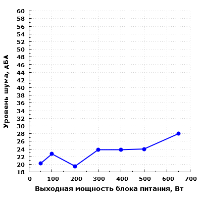 При работе на мощности до 200 Вт включительно работу блока питания можно считать условно бесшумной, уровень шума находится в пределах 23 дБА.