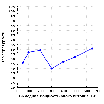 Мы изучили функционирование блока питания в гибридном режиме работы системы охлаждения. В результате было установлено, что вентилятор в блоке питания включается как при достижении пороговой температуры на термодатчике (около 60 °C), так и при достижении выходной мощности около 250 Вт. Отключение вентилятора происходит только при снижении температуры на термодатчике до определенного порога (около 35 °C). Температурный диапазон широкий, и при работе на мощности 100—200 Вт циклы старт/стоп почти отсутствуют, так как если БП включил вентилятор, то выключает он его через достаточно продолжительное время (около часа). На мощности 50 Вт и менее блок питания может долговременно работать с остановленным вентилятором. Скачкообразного роста уровня шума при запуске вентилятора отмечено не было.