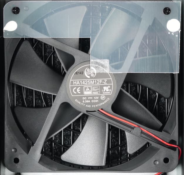 В блоке питания установлен вентилятор HA1425M12F-Z типоразмера 140 мм производства компании Hong Hua. Обычно такое обозначение соответствует решениям на гидродинамичеcком подшипнике, но на странице блока питания утверждается, что тут установлен вентилятор на подшипнике скольжения с винтовой нарезкой — это более дешевый вариант с меньшим сроком службы.