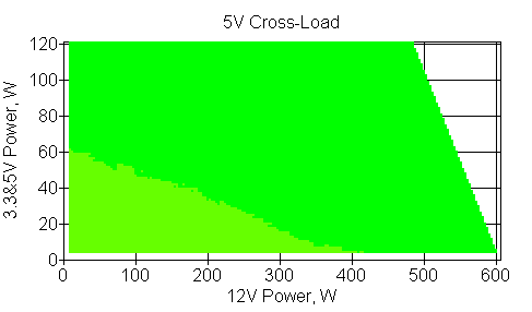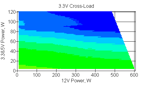Следующим этапом инструментального тестирования является построение кросснагрузочной характеристики (КНХ) и представление ее на четвертьплоскости, ограниченной максимальной мощностью по шине 3,3&5 В с одной стороны (по оси ординат) и максимальной мощностью по шине 12 В с другой (по оси абсцисс). В каждой точке измеренное значение напряжения обозначается цветовым маркером в зависимости от отклонения от номинального значения.