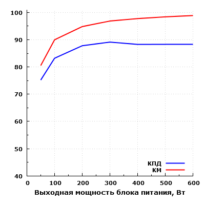 Эффективность БП находится на достойном уровне. Согласно нашим измерениям, КПД данного блока питания достигает значения свыше 88% в диапазоне мощности от 300 до 600 ватт. Максимальное зарегистрированное значение составило 89,1% на мощности 300 Вт. Одновременно с этим, КПД на мощности 50 Вт составил 75,2%.