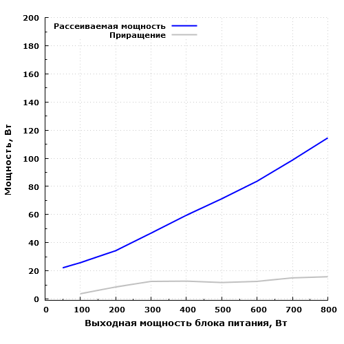 Экономичность модели находится на хорошем уровне: на максимальной мощности БП рассеивает около 114,5 Вт, 60 Вт он рассеивает на мощности порядка 400 Вт, а 100 Вт — при мощности нагрузки около 700 Вт. На мощности 50 Вт блок питания рассеивает около 22 Вт.
