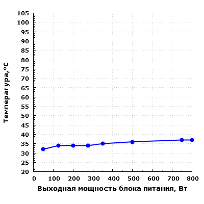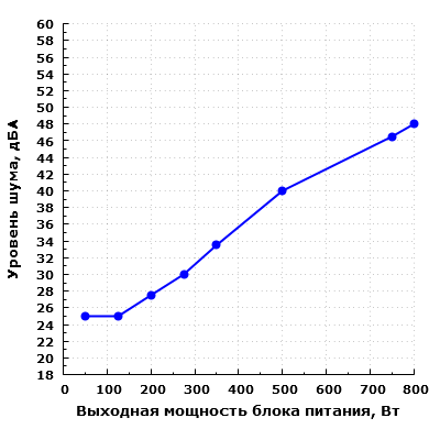 Температура выросла не очень заметно, и даже на максимальной мощности термонагруженность осталась относительно невысокой. Достигается это за счет резкого, но неравномерного увеличения уровня шума: на низкой мощности он возрос на 17 дБА, на средней — на 9,5 дБА, а на максимальной — всего на 2,5 дБА. Очевидно, что конструкция источника питания больше рассчитана на эффективное охлаждение компонентов, чем на низкий уровень шума при работе.