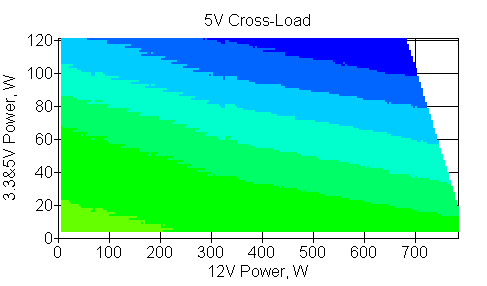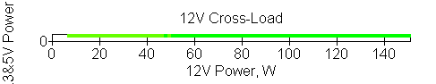 Следующим этапом инструментального тестирования является построение кросс-нагрузочной характеристики (КНХ) и представление ее на четвертьплоскости, ограниченной максимальной мощностью по шине 3,3&5 В с одной стороны (по оси ординат) и максимальной мощностью по шине 12 В с другой (по оси абсцисс). В каждой точке измеренное значение напряжения обозначается цветовым маркером в зависимости от отклонения от номинального значения.