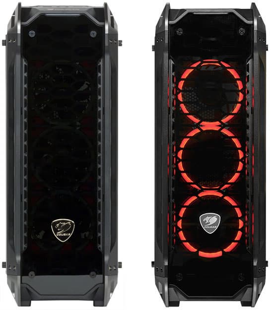 Корпус оснащен тремя 12-сантиметровыми вентиляторами Cougar Vortex LED с подсветкой красного цвета. Все они установлены как нагнетающие спереди, при этом обычного для подавляющего большинства корпусов вытяжного вентилятора на задней стенке нет, имеется только посадочное место размерностью 12 см.