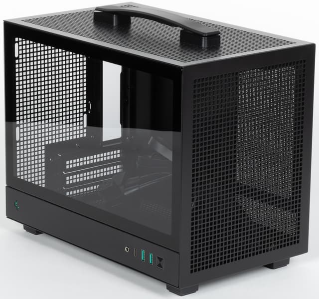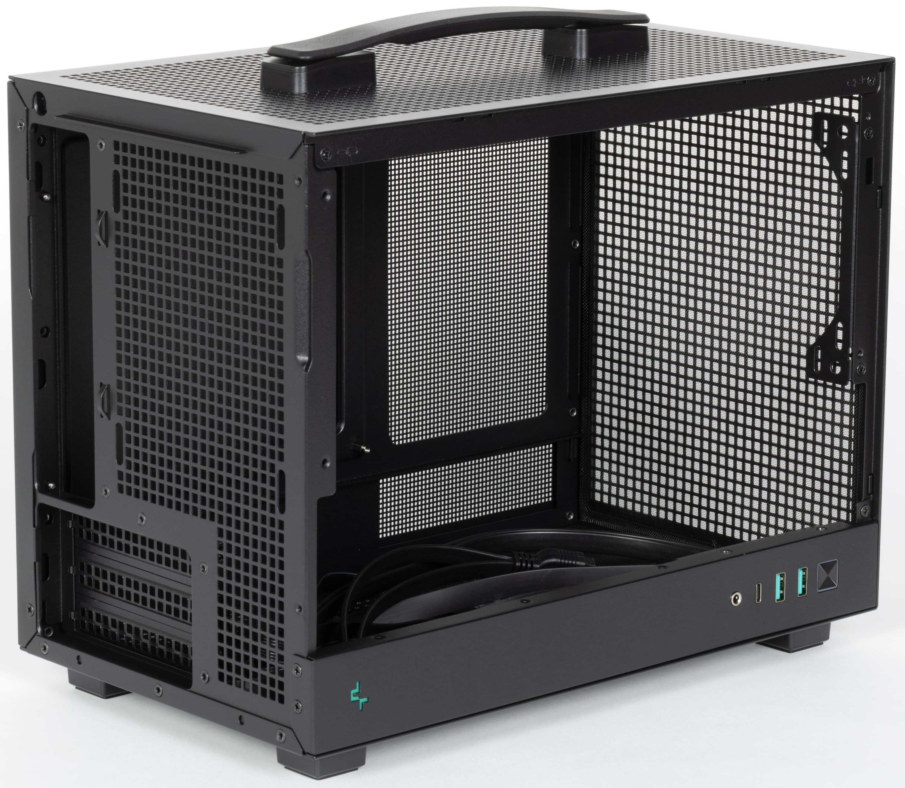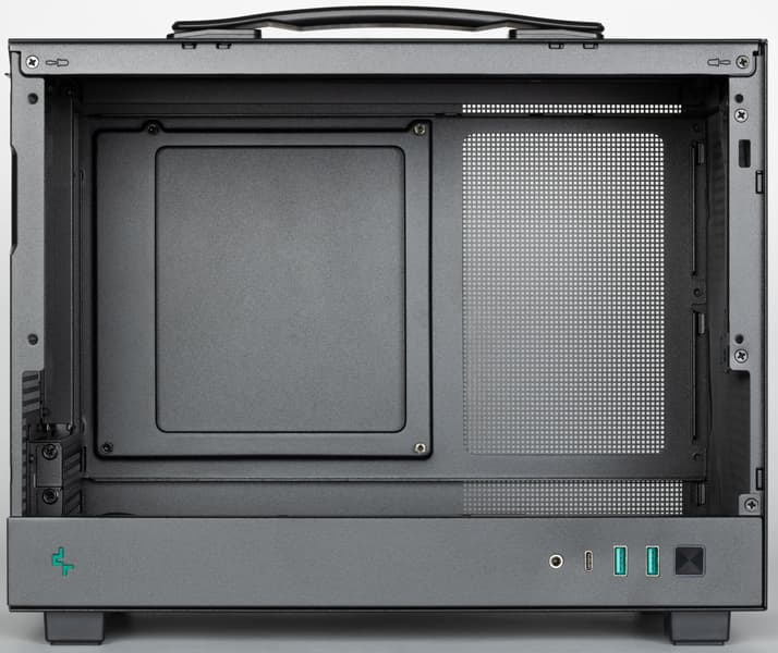 Корпус DeepCool CH160 — представитель достаточно редкого формфактора Mini-ITX, еще более редкими являются модели со штатной ручкой для переноски (в нашей лаборатории это второй случай за много лет), тем более столь компактные. Конечно, носить компьютер надо не всем, а если и надо, то вряд ли такое бывает часто, к тому же любой корпус можно взять под мышку или в охапку и перенести с места на место, хотя на расстояниях больше чем из комнаты в комнату это не слишком удобно. Но уж необходимость приподнимать корпус компьютера над столом, чтобы протереть под ним пыль, вполне реальна, и при наличии ручки это делать куда удобнее.