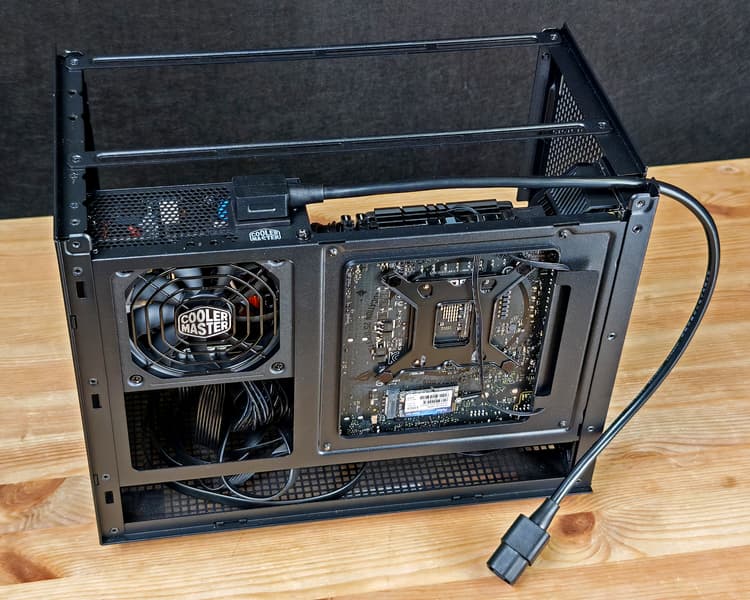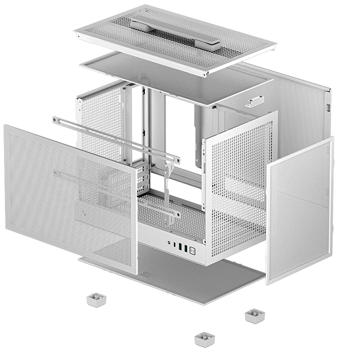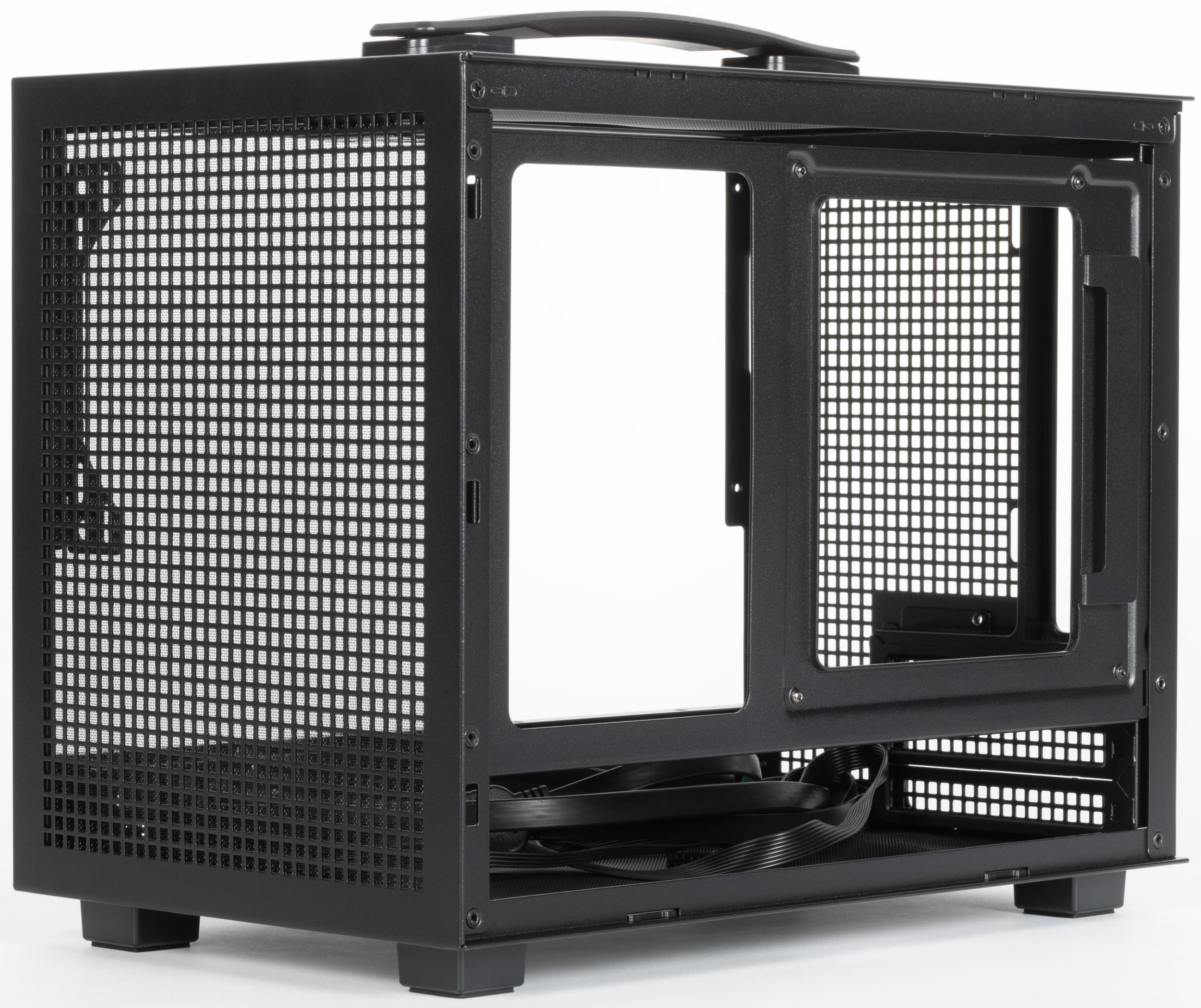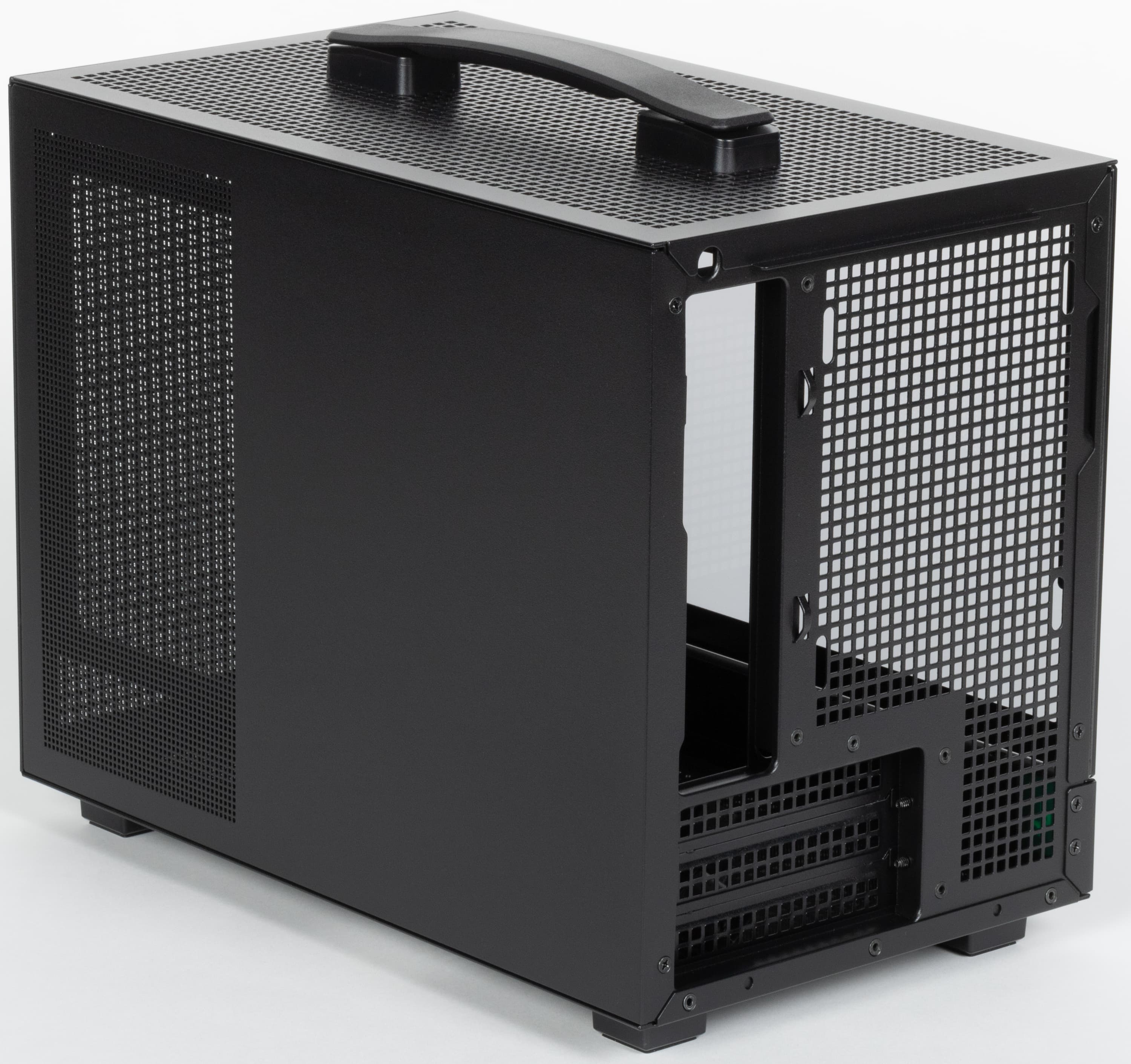Корпус представляет собой решение условно башенного типа с вертикально размещаемой платой формата Mini-ITX и вертикальным расположением в передней части корпуса блока питания любого из трех форматов: ATX (длиной до 140 мм), SFX и удлиненного SFX-L. При установке БП используется монтажный кронштейн, для которого предусмотрены два положения, а к сети блок питания подключается при помощи имеющегося в комплекте удлинителя, его надо прокладывать внутри корпуса и выводить наружу через U-образный вырез в верхней части задней стенки.
