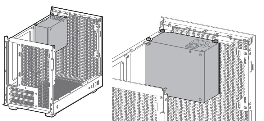 Блок питания вставляется в правой передней части корпуса вертикально (возможно, придется сначала удалить хотя бы одну монтажную планку для верхних вентиляторов, открутив винты на концах), двумя винтами из комплекта он крепится к правой верхней боковой кромке шасси, еще одним — к специально предусмотренному кронштейну, для которого предусмотрены положения, соответствующие двум вариантам размещения БП: вдоль боковой плоскости корпуса либо вдоль фронтальной (для ATX это единственный способ установки).