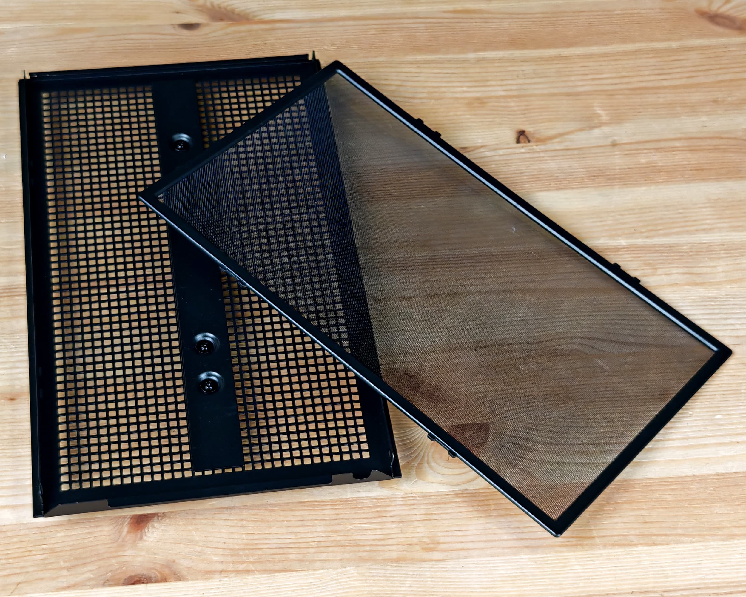 Фильтры установлены изнутри, легкосъемными их назвать нельзя даже с большой натяжкой. С верхним фильтром немного проще, хотя и для доступа к нему придется открутить восемь винтов, чтобы удалить боковые стенки, а затем снять верхнюю крышку, но после этого вынуть его не составит труда.