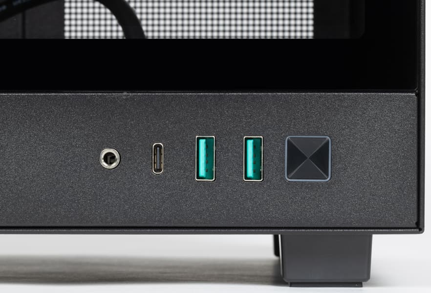 Как сказано чуть выше, интерфейсные разъемы и кнопка расположены внизу в передней части левой плоскости шасси, то есть для доступа к ним слева от компьютера надо предусмотреть свободное пространство. Перечислим, начиная от лицевой панели: квадратная кнопка питания со встроенной индикацией включения, два порта USB Type-A и один USB Type-C, комбинированный миниджек для гарнитуры. Индикатора дисковой активности и кнопки перезагрузки нет.