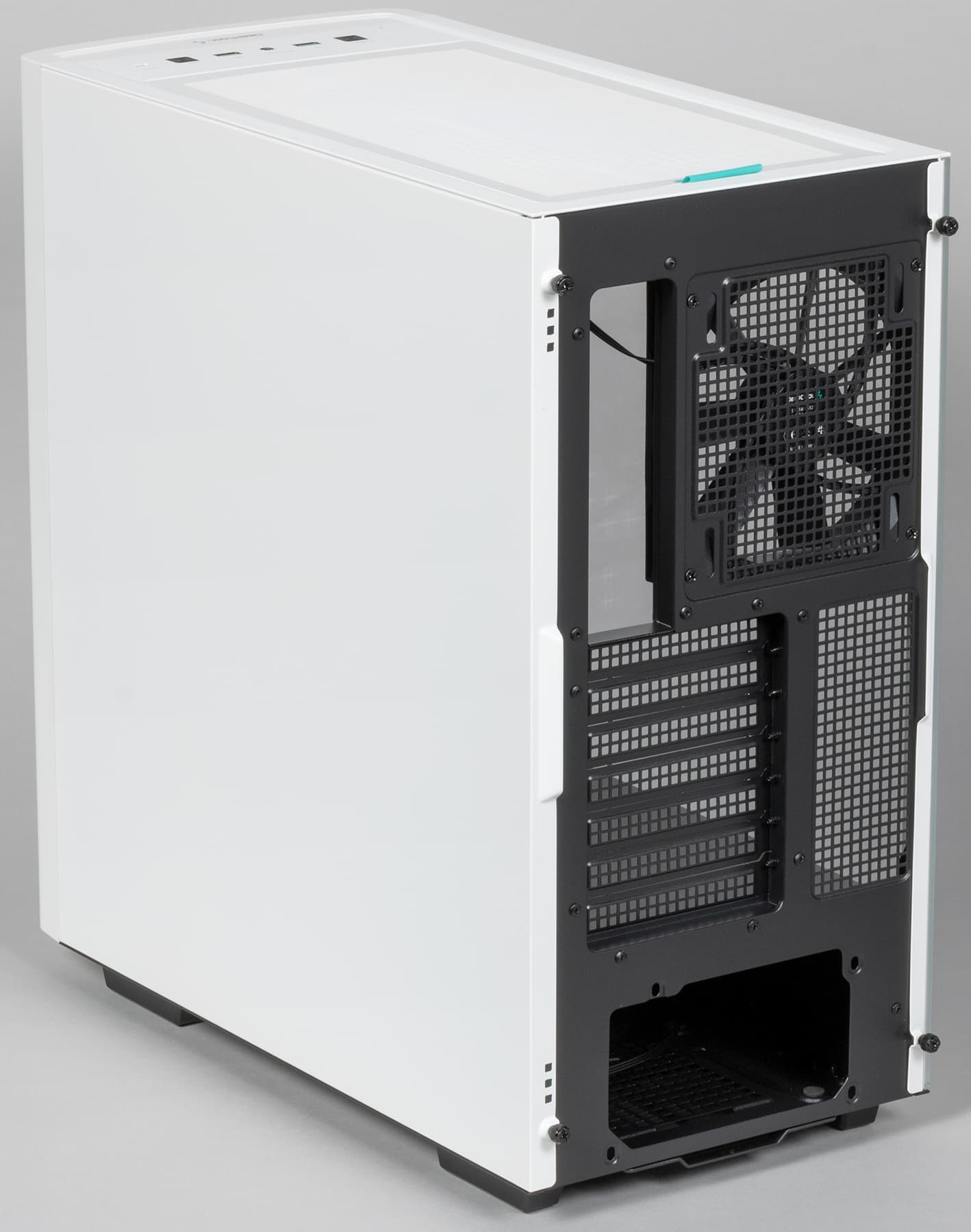 Deepcool CK560 выпускается в двух цветовых вариантах, черном и белом, и к нам на тестирование попал корпус в белом оформлении. Стоит отметить, что белый он только снаружи, тогда как шасси полностью черное, включая заднюю панель. Это скорее достоинство, чем недостаток, так как с обликом полностью белых корпусов обычно сильно дисгармонируют типичные черные провода внутри, а так черно-белое сочетание подразумевается изначально. Впрочем, как всегда, вопросы вкусовых предпочтений не являются предметом нашего обзора.