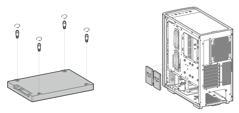 Всего в корпус можно установить 4 накопителя формата 2,5 дюйма или 2×3,5″ и 2×2,5″. Этого более чем достаточно для типичного домашнего или офисно-рабочего компьютера. Корзину обдувает передний вентилятор.