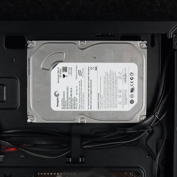 Для одного накопителя формата 3,5″ предусмотрено посадочное место на обратной стороне основания для системной платы около передней стенки шасси. Фиксация накопителя осуществляется при помощи винтов, которые нужно закрутить в накопитель со стороны дна сквозь основание для системной платы (с лицевой стороны). Данное место, судя по всему, в характеристиках корпуса никак не учитывается и в инструкции по сборке не фигурирует.