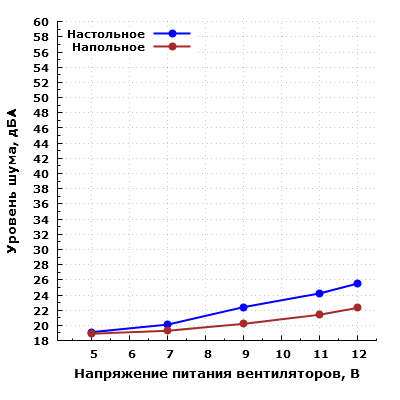 Уровень шума и при напольном, и при настольном размещении корпуса очень низкий во всем диапазоне регулирования напряжения вентиляторов (от 5 до 12 вольт). Но достигается это благодаря использованию одного низкоскоростного вентилятора, установленного сзади. Для большинства недорогих конфигураций этого будет вполне достаточно, особенно с учетом наличия верхнего выхлопа. При сборке системы с высоким тепловыделением корпус можно оснастить вентилятором сверху, который обеспечит улучшенный теплоотвод, а также заменить задний вентилятор и лучше на модель с ШИМ-управлением.