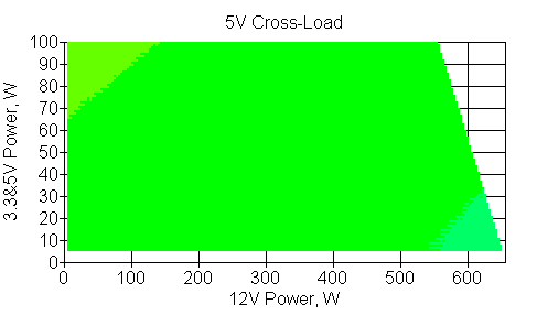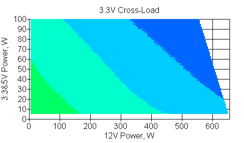 Следующим этапом инструментального тестирования является построение кросснагрузочной характеристики (КНХ) и представление ее на четвертьплоскости, ограниченной максимальной мощностью по шине 3,3&5 В с одной стороны (по оси ординат) и максимальной мощностью по шине 12 В с другой (по оси абсцисс). В каждой точке измеренное значение напряжения обозначается цветовым маркером в зависимости от отклонения от номинального значения.