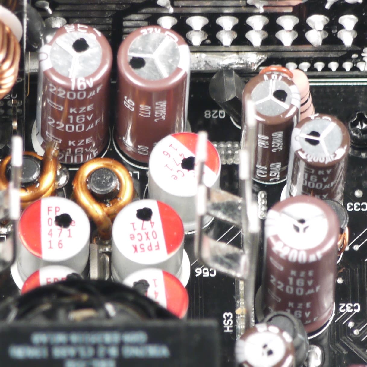 Конденсаторы в блоке питания имеют преимущественно японское происхождение. В основной массе это продукция под торговой маркой Nippon Chemi-Con. Установлено и большое количество полимерных конденсаторов.