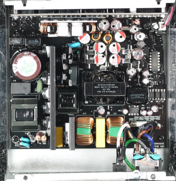 Конструкция блока питания вполне соответствует современным тенденциям: активный корректор коэффициента мощности, синхронный выпрямитель для канала +12VDC, независимые импульсные преобразователи постоянного тока для линий +3.3VDC и +5VDC.