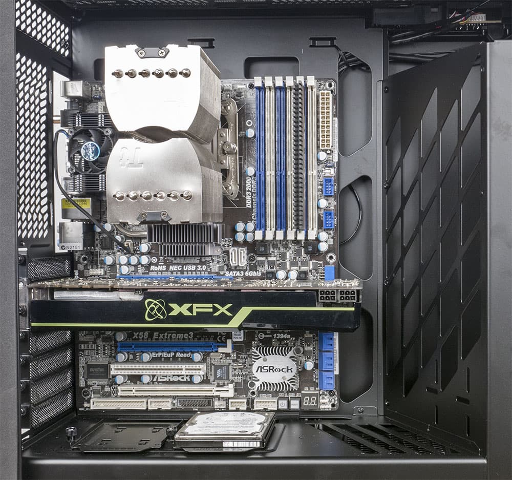 Стойка для дисковых накопителей крепится к днищу шасси винтами, причем ее можно перемещать на 4 см, чтобы освободить место для блока питания повышенной мощности и соответственно большого размера. В ближнем к передней стенке положении стойки для БП с выходящими из него пучками проводов остается около 24 см; если и этого мало, то стойку можно удалить вовсе, но тогда дисков можно будет разместить всего два, причем только 2,5-дюймовых.