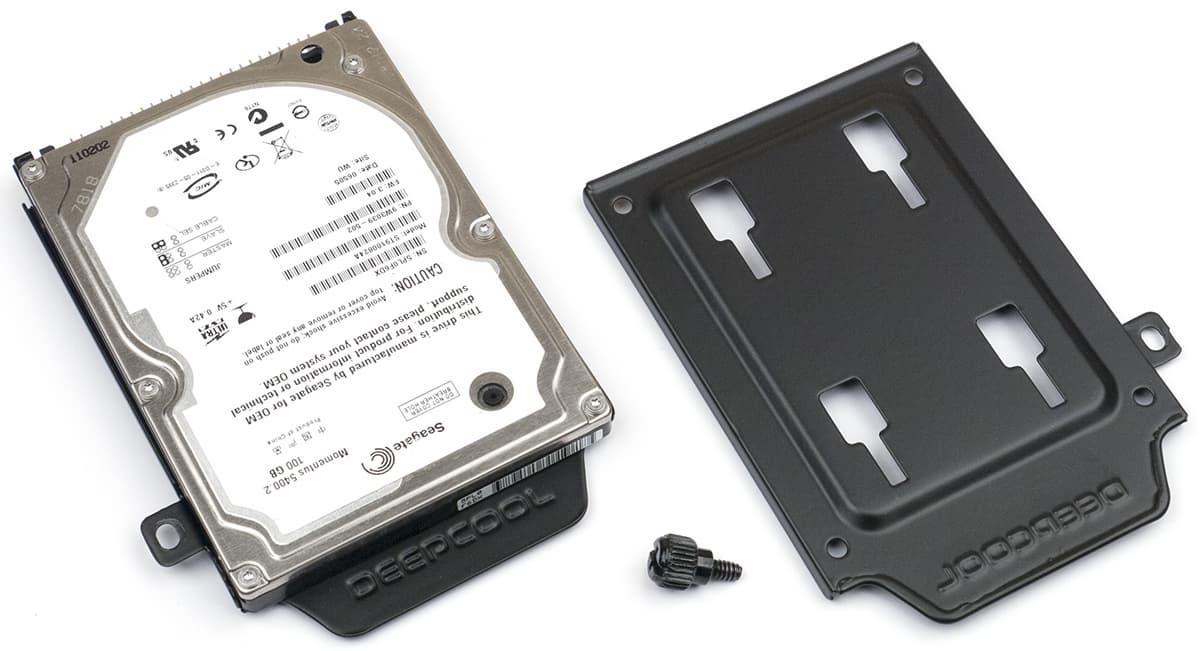 Лотки размерности 2,5 дюйма совсем простенькие. Накопители к ним тоже крепятся винтами, а сам лоток имеет прорези, которыми и закрепляется на соответствующих выступах горизонтальной перегородки нижнего отсека или тыльной части основания системной платы. Для фиксации используется винт с накатной головкой. SATA-кабели для SSD/HDD на лотках понадобятся с прямыми коннекторами.