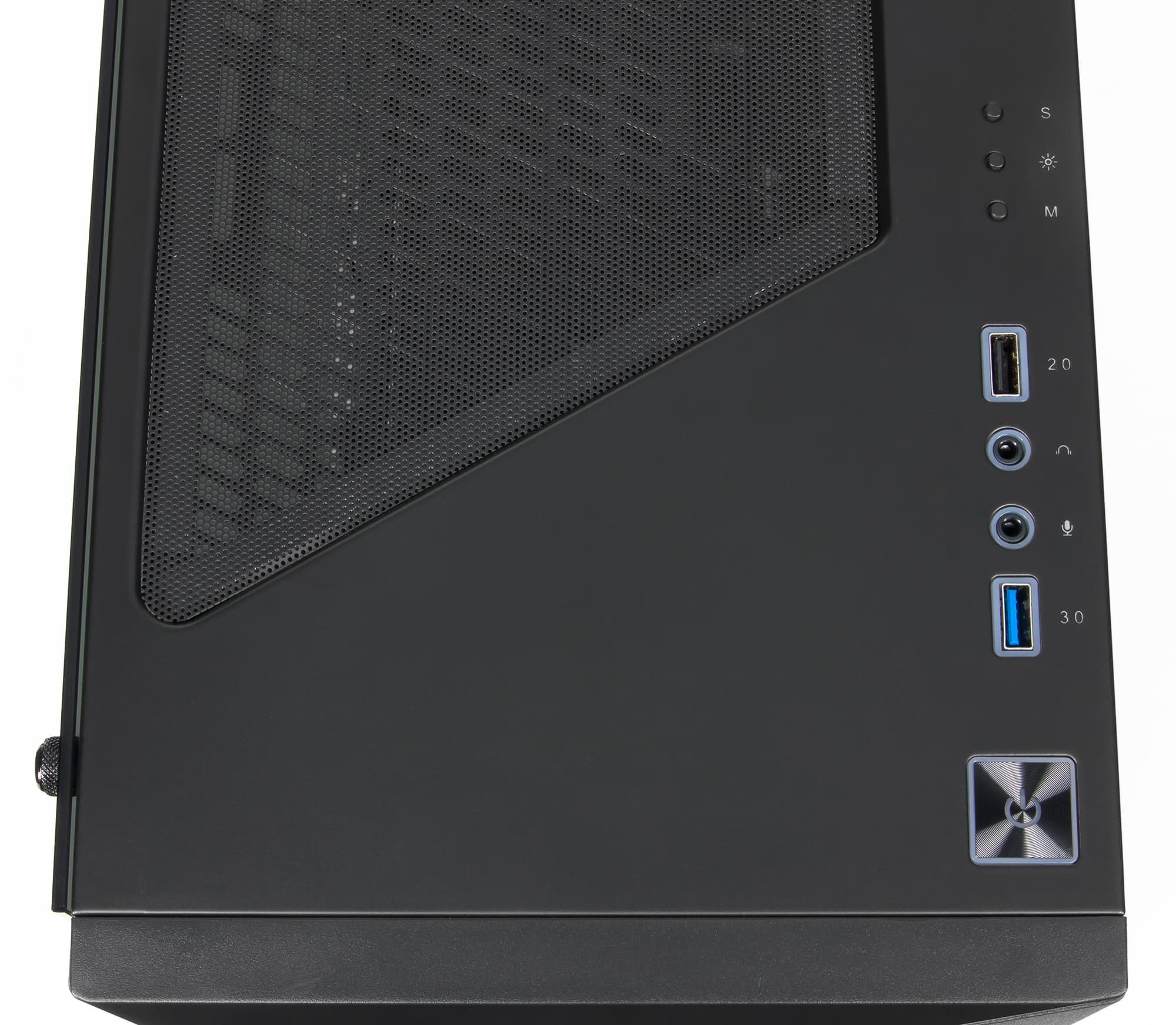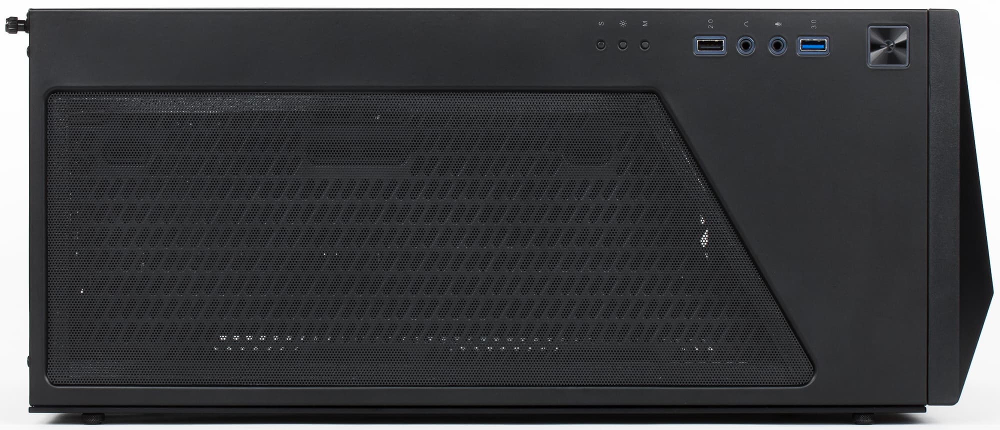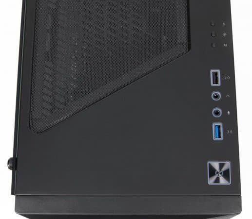 Органы на панели следующие: впереди большая квадратная кнопка Power, затем порт USB 3.0, пара аудиоразъемов, порт USB 2.0 и три кнопки, управляющие подсветкой. Кнопка Reset отсутствует. Такое расположение портов USB позволит одновременно подключать к ним широкие устройства, но в некоторых случаях может быть затруднен доступ к звуковым гнездам.