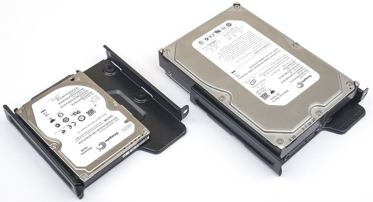 К универсальным салазкам накопители обеих размерностей крепятся винтами снизу, причем 2,5-дюймовые непосредственно к металлу салазок, а 3,5-дюймовые через резиновые амортизаторы. Для подключения лучше использовать SATA-кабели с Г-образными коннекторами.