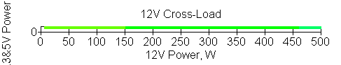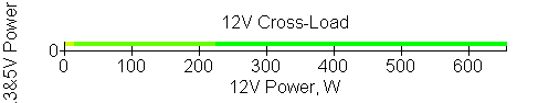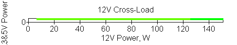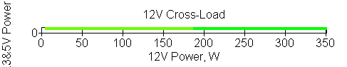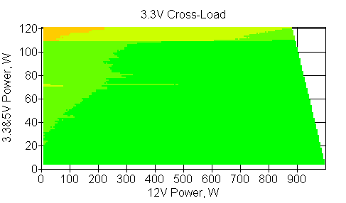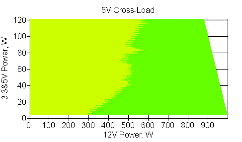 Следующим этапом инструментального тестирования является построение кросснагрузочной характеристики (КНХ) и представление ее на четвертьплоскости, ограниченной максимальной мощностью по шине 3,3&5 В с одной стороны (по оси ординат) и максимальной мощностью по шине 12 В с другой (по оси абсцисс). В каждой точке измеренное значение напряжения обозначается цветовым маркером в зависимости от отклонения от номинального значения.