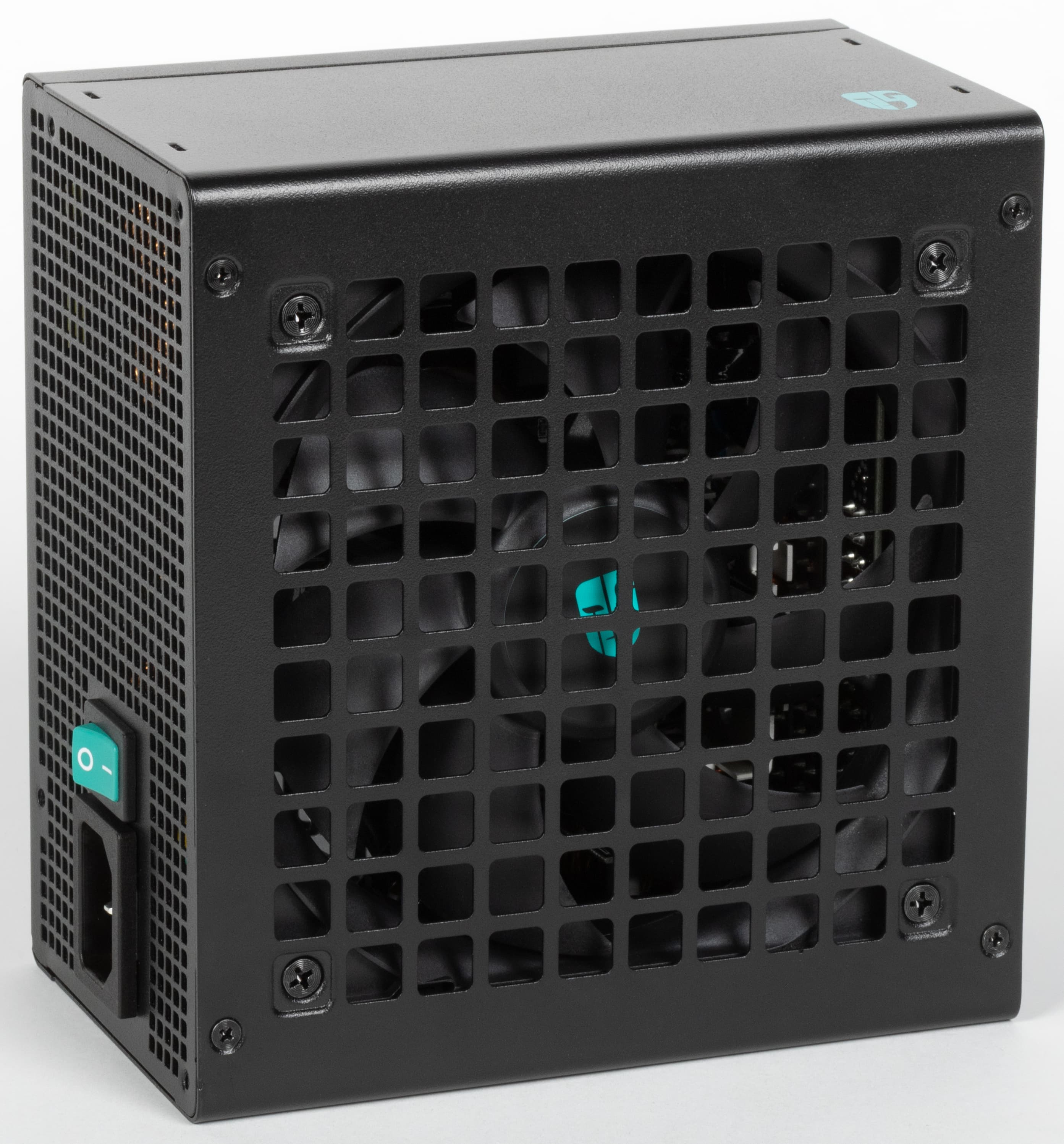 Дизайн этого блока питания выглядит весьма симпатично. Однако применение штампованной решетки над вентилятором чревато повышенным уровнем шума при работе. Впрочем, сейчас штампованные решетки применяются всё чаще и чаще, так как они, видимо, проще в изготовлении, а БП с такими решетками чуть дешевле в производстве. Режим работы системы охлаждения тут один: активный — с постоянно вращающимся вентилятором.
