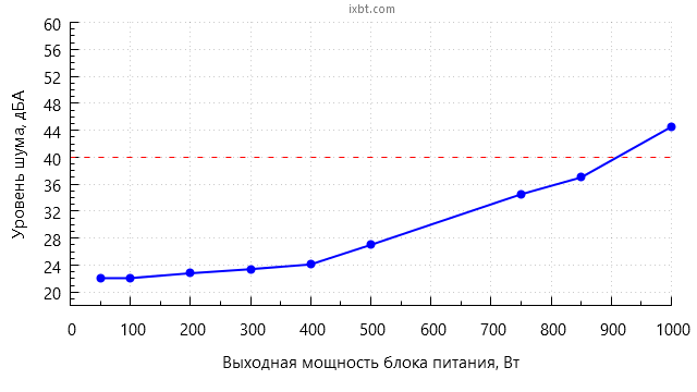 В диапазоне мощности до 400 Вт включительно шум блока питания находится на минимально заметном уровне для жилого помещения в дневное время суток (25 дБА и менее).