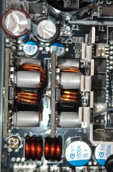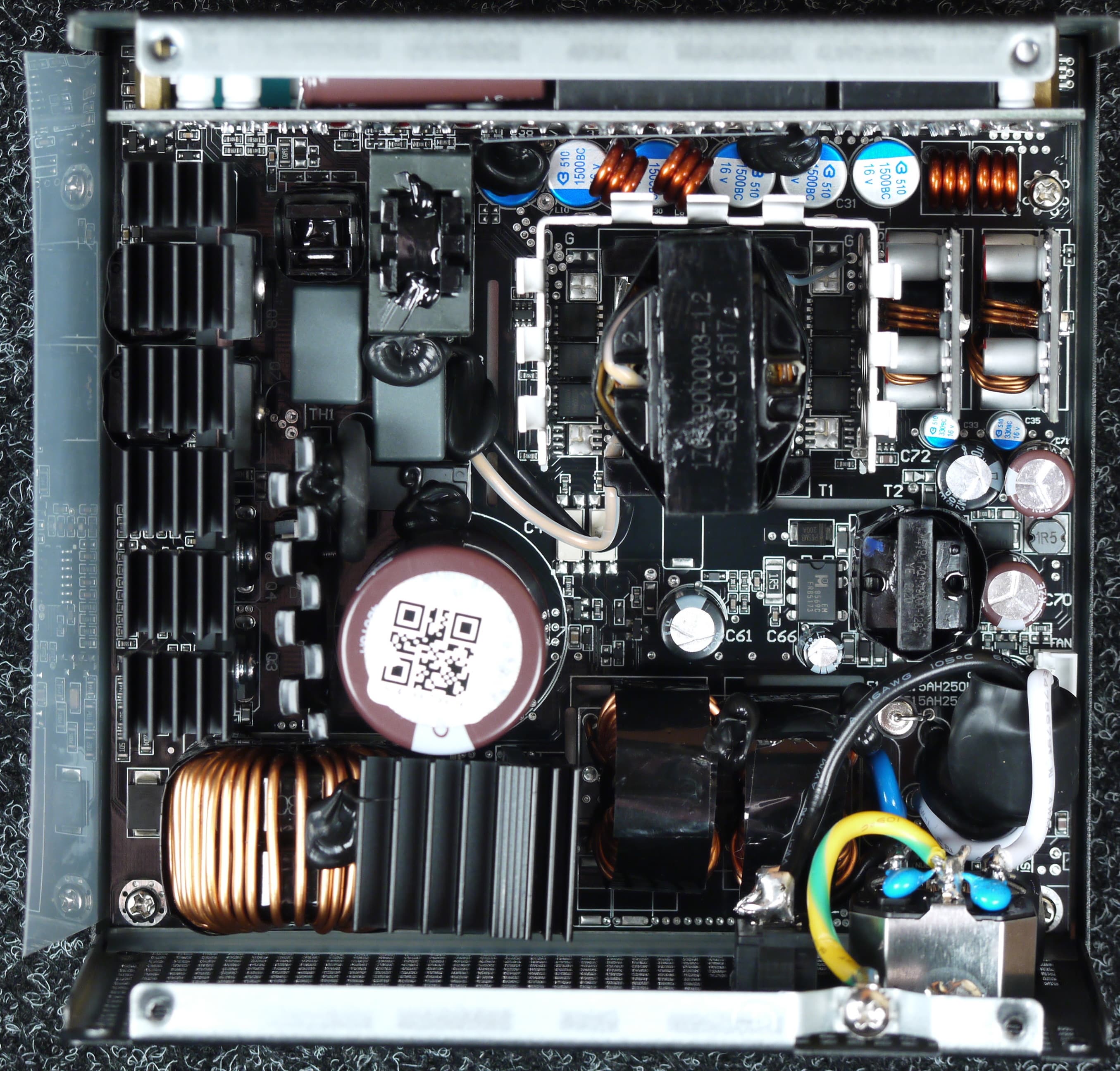 Высоковольтные силовые элементы установлены на нескольких радиаторах разных размеров, транзисторы синхронного выпрямителя установлены с лицевой стороны основной печатной платы, на них нет радиаторов, но вокруг места установки есть теплорассеивающие элементы.