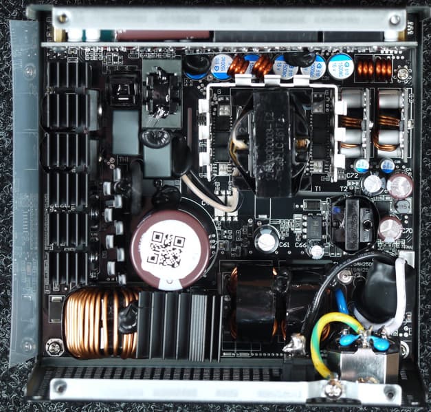 Конструкция блока питания вполне соответствует современным тенденциям: активный корректор коэффициента мощности, синхронный выпрямитель для канала +12VDC, независимые импульсные преобразователи постоянного тока для линий +3.3VDC и +5VDC.