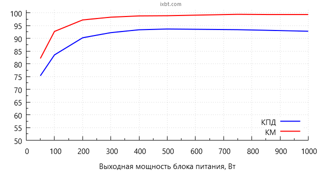 Всего таким образом мы измерили параметры блока питания в 9 точках. В результате максимальный КПД в нашем случае составил 93,7% при выходной мощности 500 Вт. Максимальная рассеиваемая мощность составила 78 Вт при работе на нагрузку 1000 Вт, что является отличным показателем для блока питания подобной мощности.