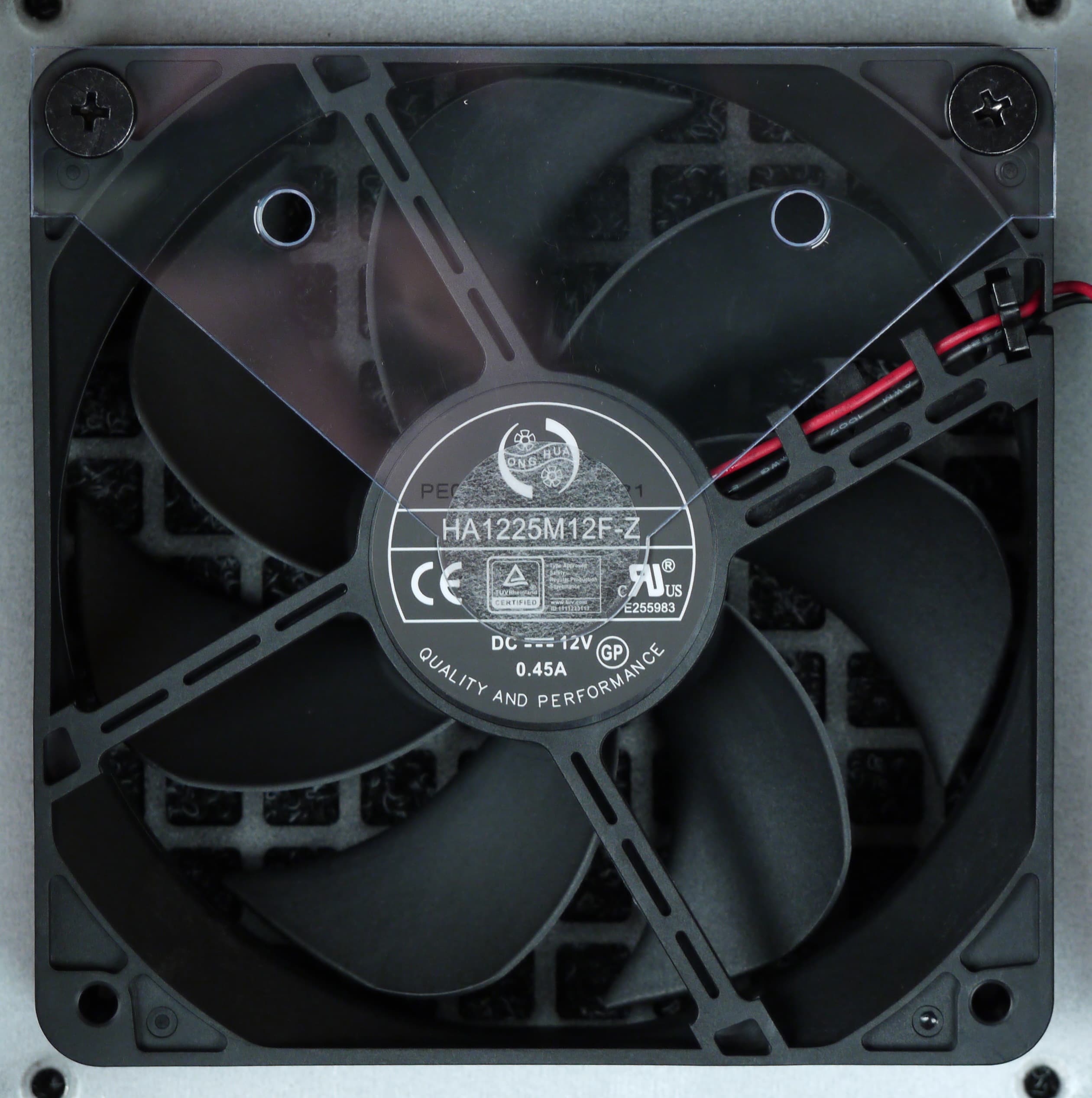 В блоке питания установлен вентилятор Honghua HA1225M12F-Z типоразмера 120 мм (2050 об/мин), подключение двухпроводное, через разъем. Вентилятор основан на гидродинамическом подшипнике, что подразумевает долгий срок его службы.