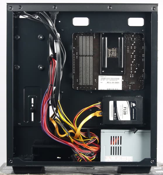 На оборотной стороне основания для системной платы присутствуют места для установки накопителей. А вот посадочные места для накопителей с внешним доступом в корпусе полностью отсутствуют.