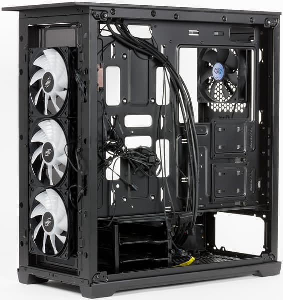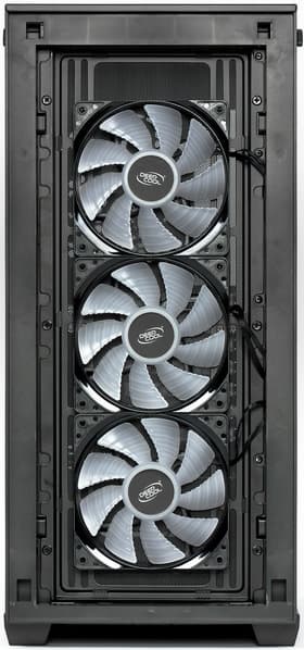 Deepcool Matrexx 70 представляет собой решение бюджетного уровня, хотя откровенно дешевым его назвать нельзя. Из особенностей можно отметить наличие боковой стенки и передней панели из стекла, а также комплектацию корпуса четырьмя вентиляторами с полнофункциональной ARGB-подсветкой, что в случае корпусов подобной стоимости встречается весьма редко. Система подсветки предусматривает не только ручное, но и программное управление от системной платы.