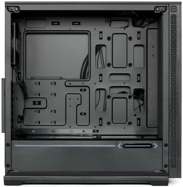 Передняя панель состоит из двух частей: пластикового основания и стеклянной накладки, которая извлекается при помощи кнопки, размещенной с левой стороны. Под стеклом находится кронштейн с вентиляторами, который прикручен к шасси корпуса.